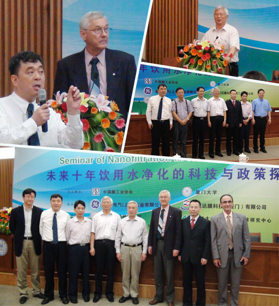 早在1999年時(shí)任福建省省長(zhǎng)的習(xí)近平來廈門大學(xué)調(diào)研時(shí)就指出:“膜技術(shù)是世界公認(rèn)的21世紀(jì)綠色、節(jié)能的高科技產(chǎn)業(yè)技術(shù)”。膜技術(shù)在微濾、超濾、納濾、反滲透等水凈化工藝中正在發(fā)揮越來越大的作用。本次高端論壇特邀美國(guó)GE公司水與工藝技術(shù)總工程師Peter Eriksson博士、中國(guó)膜工業(yè)協(xié)會(huì)名譽(yù)理事長(zhǎng)、國(guó)家液體分離膜工程技術(shù)中心首席科學(xué)家高從堦院士、新加坡國(guó)立大學(xué)李光耀公共學(xué)院特約研究員、國(guó)家發(fā)改委水政策專家楊尚寶教授、華中科技大學(xué)同濟(jì)醫(yī)學(xué)院公共衛(wèi)生學(xué)院飲用水安全與環(huán)境毒理學(xué)專家吳志剛教授、中國(guó)膜工業(yè)協(xié)會(huì)副理事長(zhǎng)、廈門大學(xué)水科技與政策中心首席科學(xué)家藍(lán)偉光教授齊聚廈大,共同探討了未來十年膜技術(shù)在解決飲用水問題中的地位和作用;膜技術(shù)在海水淡化、污廢水處理等領(lǐng)域中的應(yīng)用,通過水的循環(huán)利用解決水資源短缺問題;特別是納濾技術(shù)發(fā)展到今天,已能濾除水中的微污染,包括重金屬和有機(jī)化合物,又能保留水中微量的天然礦物質(zhì),是目前解決飲用水問題的方案,如果說膜技術(shù)是水處理的皇冠技術(shù),那么納濾技術(shù)就是鑲嵌在這頂皇冠上的明珠。